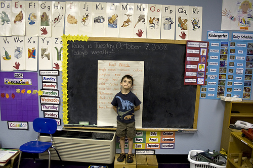 A boy in school, standing in front of a blackboard.