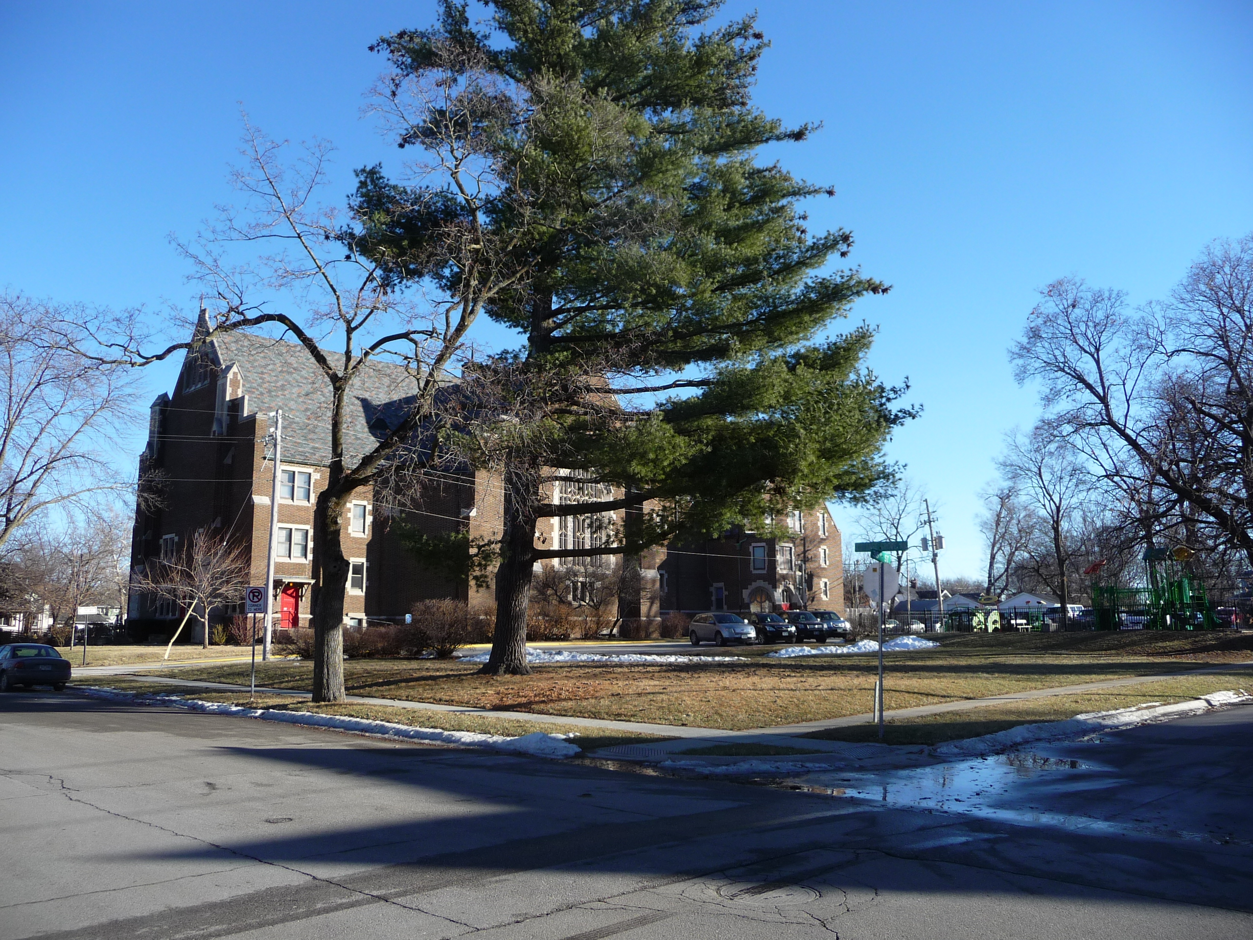 Grace UMC in Des Moines and the corner at 38th Street and Cottage Grove Avenue where a marker honoring Henry A. Wallace would be placed. Credit: Paula Ann Mohr.
