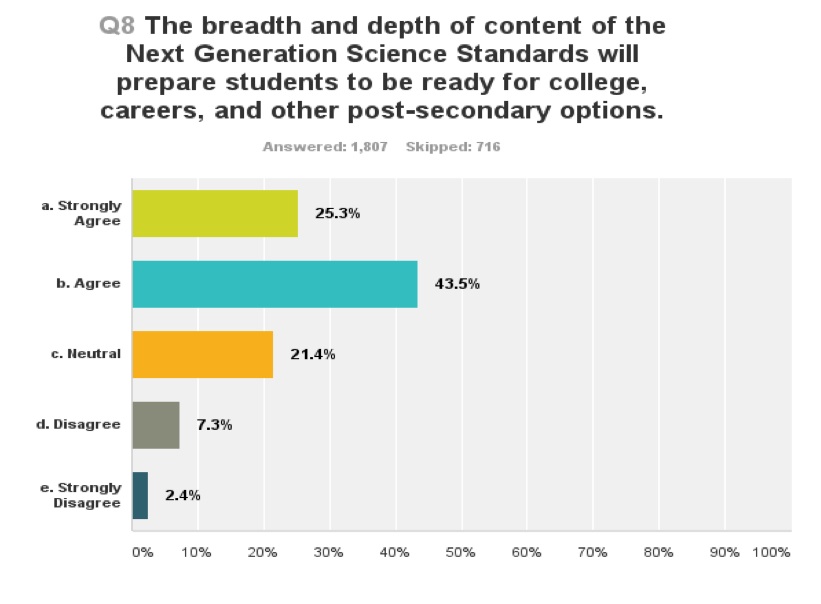 The meat of the survey: 1,807 respondents answered the question “The breadth and depth of the content of the Next Generation Science Standards will prepare students to be ready for college, careers, and other post-secondary options.”