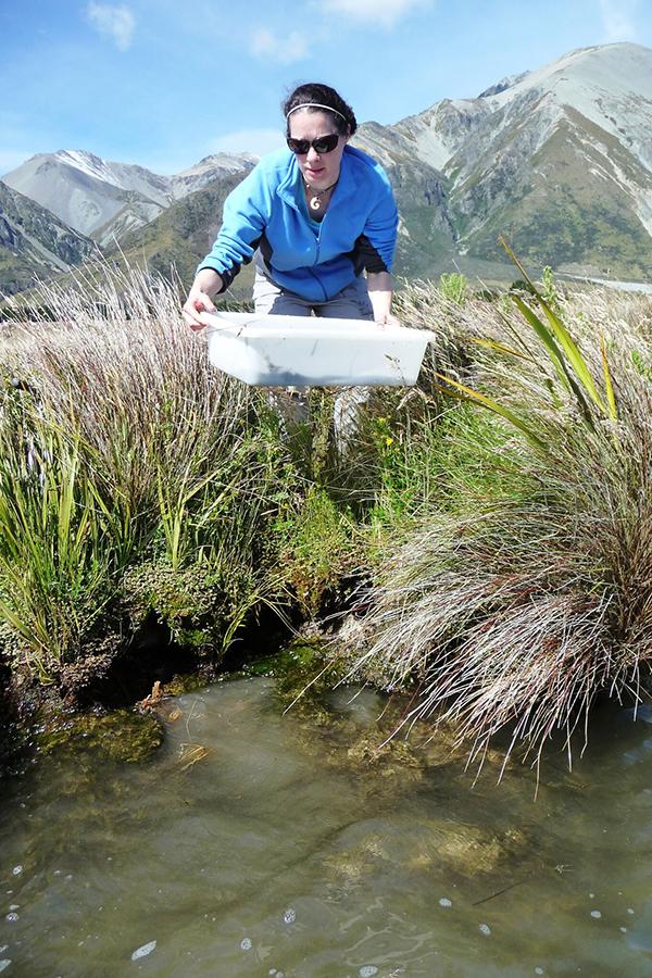 Maurine Neiman, collecting freshwater snails at Lake Grasmere, on the South Island of New Zealand. She and her colleagues found sexual reproduction yields new gene combinations that help the snails fend off threats. Photo courtesy of Neiman, from the U of I news website.