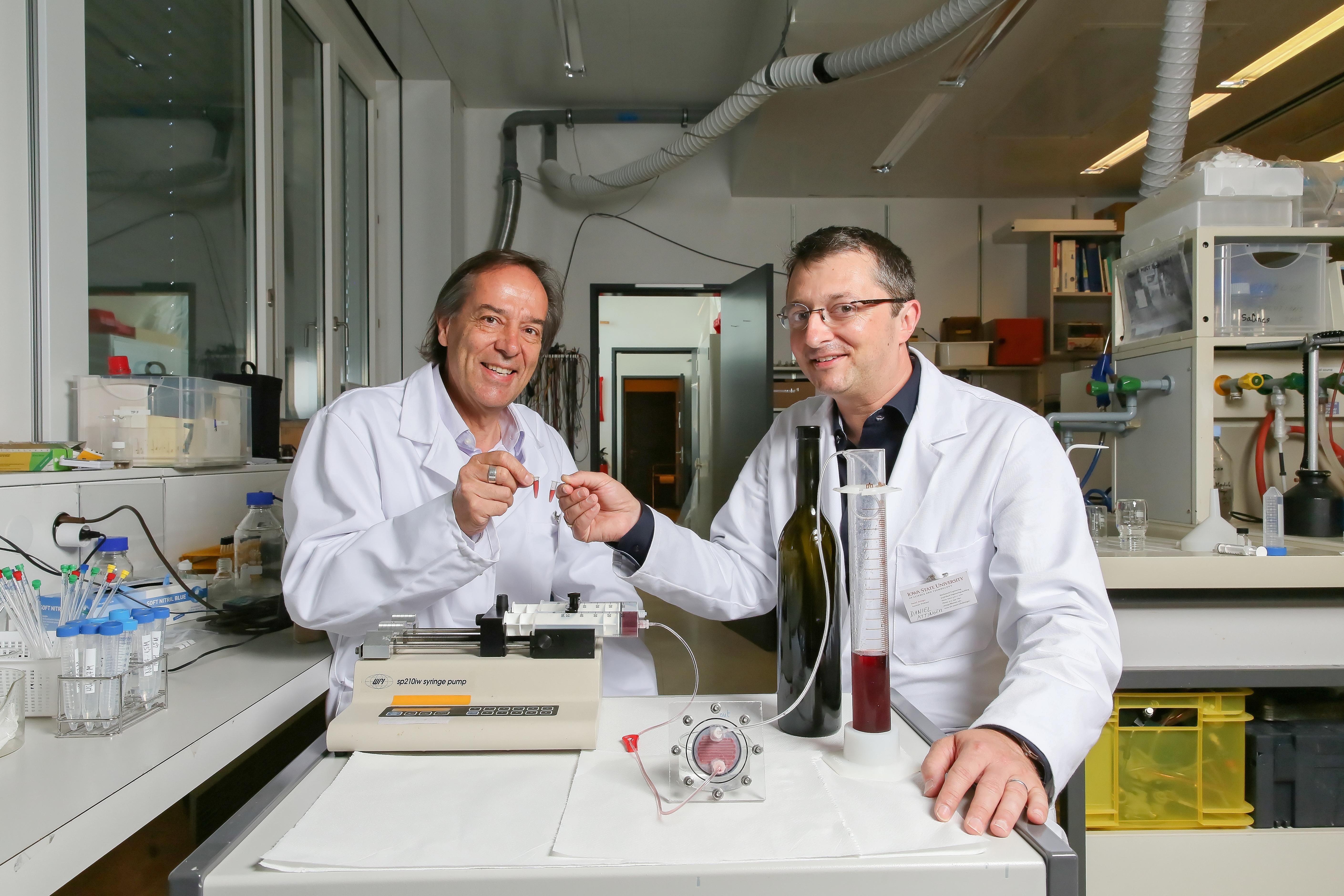 Phillippe Renaud, left, and Daniel Attinger make a tiny toast with wine from Attinger’s microfluidics fermenter, front and center. How does it taste? Meh, Renaud says. Click to enlarge. Photo credit: Ecole Polytechnique Fédérale de Lausanne.