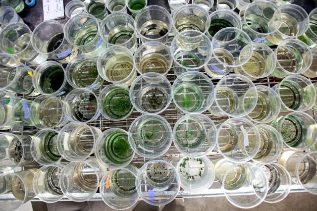 In their cups: University of Iowa researchers grew multiple generations of tiny freshwater snails in the lab to study whether having multiple genomes provides advantages. Photo by Justin Torner from the U of I news website.