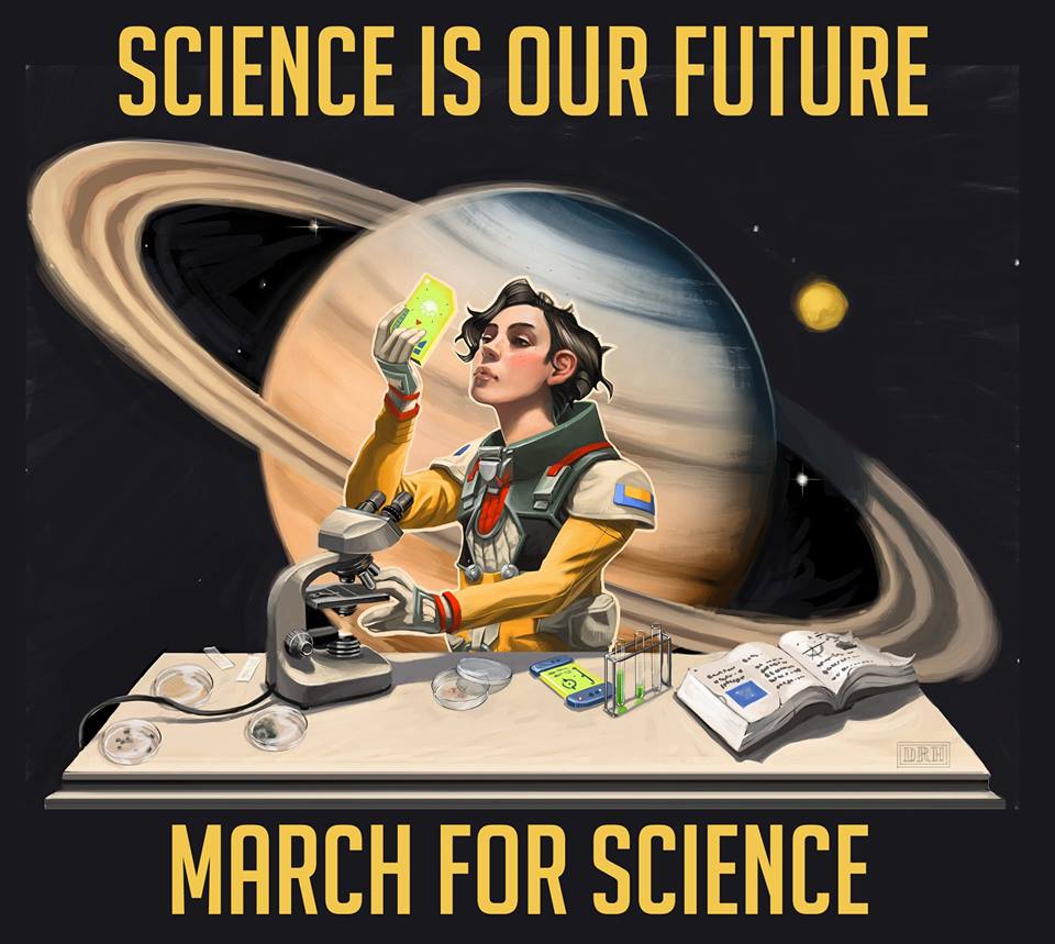 A March for Science Iowa comic by designer Miles Greb (@goldrushcomic) via the March for Science Iowa Facebook page. I think the model looks like a dark-haired Scarlett Johanssen.